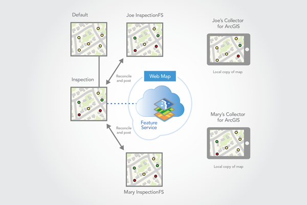 To do this, a web map is available in the company's organizational account for members of the office workers group. A worker who is a member of this group can access the web map using Collector running on one of the available devices in the office. Before leaving the office, the worker downloads the map using Collector. The worker then goes into the field and inspects the requested updates. Corrections are made in the field using Collector. When back in the office, the worker's corrections are synchronized with the feature service, and reconciled and posted with the default version.